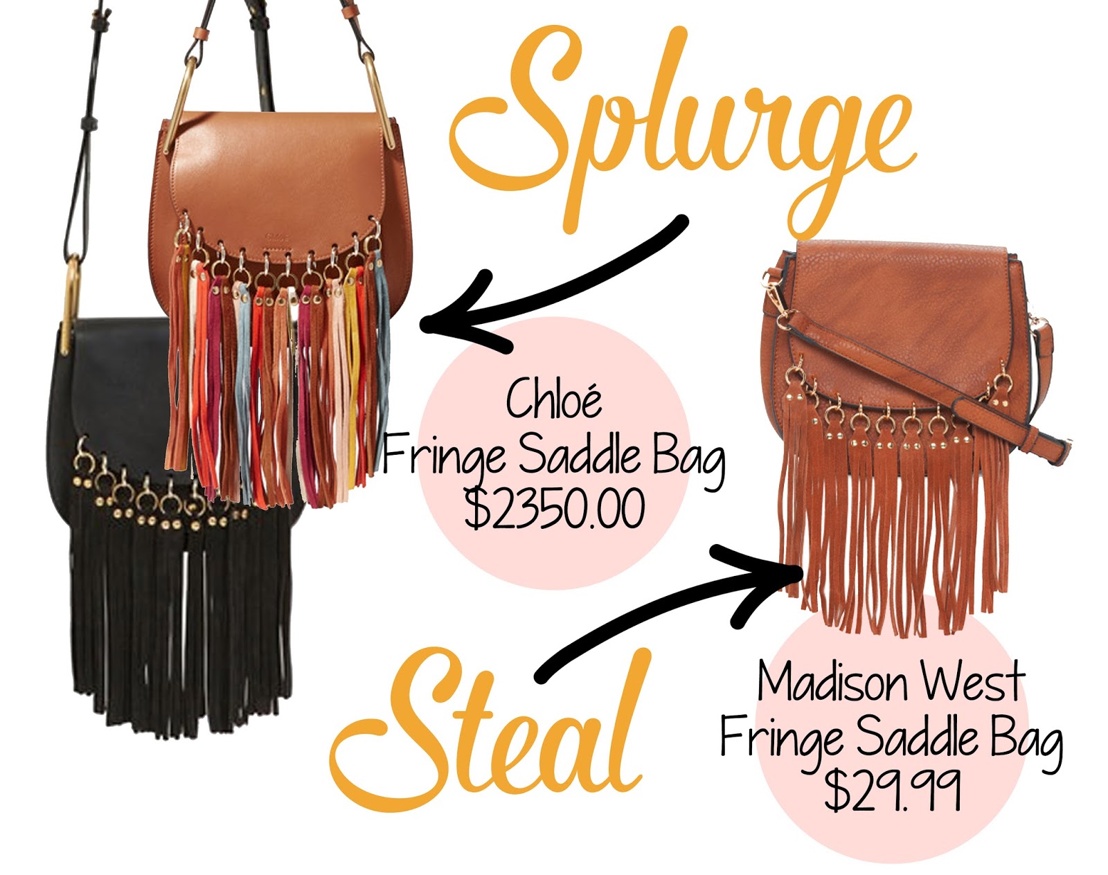 The second bag is also the Chloé tassel saddle bag but just a slightly different version. This bag is just as fantastic but the tassels are knotted instead of attached to rings and you can find the dupe version on TJ Maxx for $19.99. I actually like the dupe version better on this one because I love anything Taupe. Taupe is the most perfect neutral color because it can work for any season! Which bag would you choose??? The Splurge or Steal???