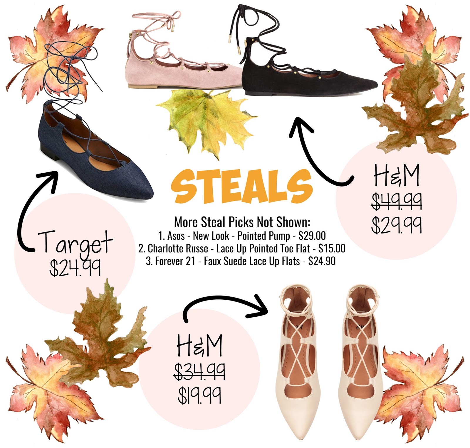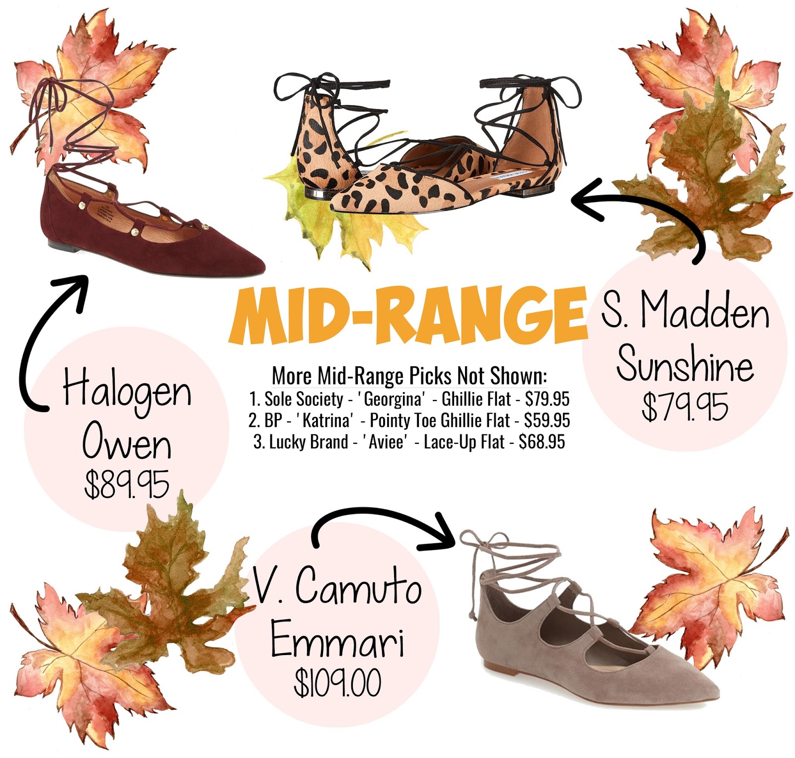 Halogen is probably the top contender right now in this style of flat that is a more mid-range price. They are not super expensive but they are also not cheap but their signature lace-up flats will run you close to $90 a pop! I won’t lie, I do own 2 pairs of the Halogen ones but Steve Madden also has a few styles coming in slightly less at around $80 each……but if $80 for a pair of shoes is still too much their are tons of other affordable options out there!