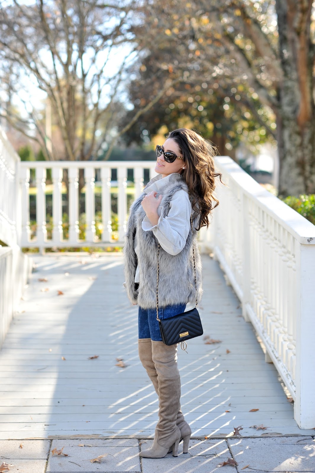 I paired this top with my new faux fur vest from Amazon and I really like the look of the two pieces together. Faux fur vests are a great way to add a stylish layer that keeps you warm without having to wear a bulky coat. I also wore my Steve Madden OTK boots which are a total designer dupe for around $100. Steven Madden has some great OTK boots that won’t break the bank! These specific boots are actually sold out right now but Zappos carries lots of OTK boots from Steve Madden so you can still find a ton of great options and I do find that Steve Madden boots and shoes tend to run true-to-size so you can get your regular size.